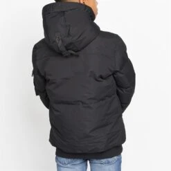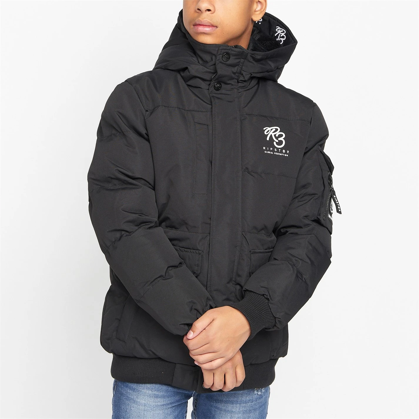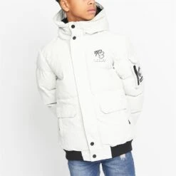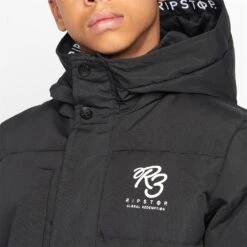 Boys padded jacket with funnel neck and fixed hood and ribbed hem and cuffs. Welted pockets, sewn on patch pocket. Two rubber badges on left sleeve, print on inner hood edge and chest.