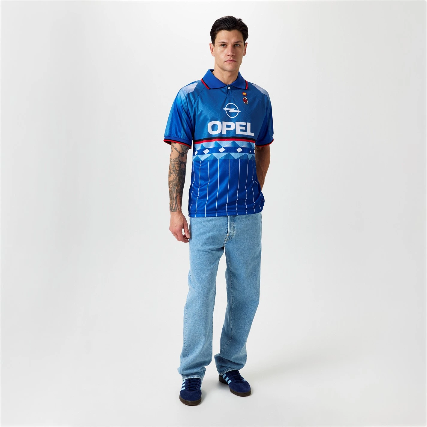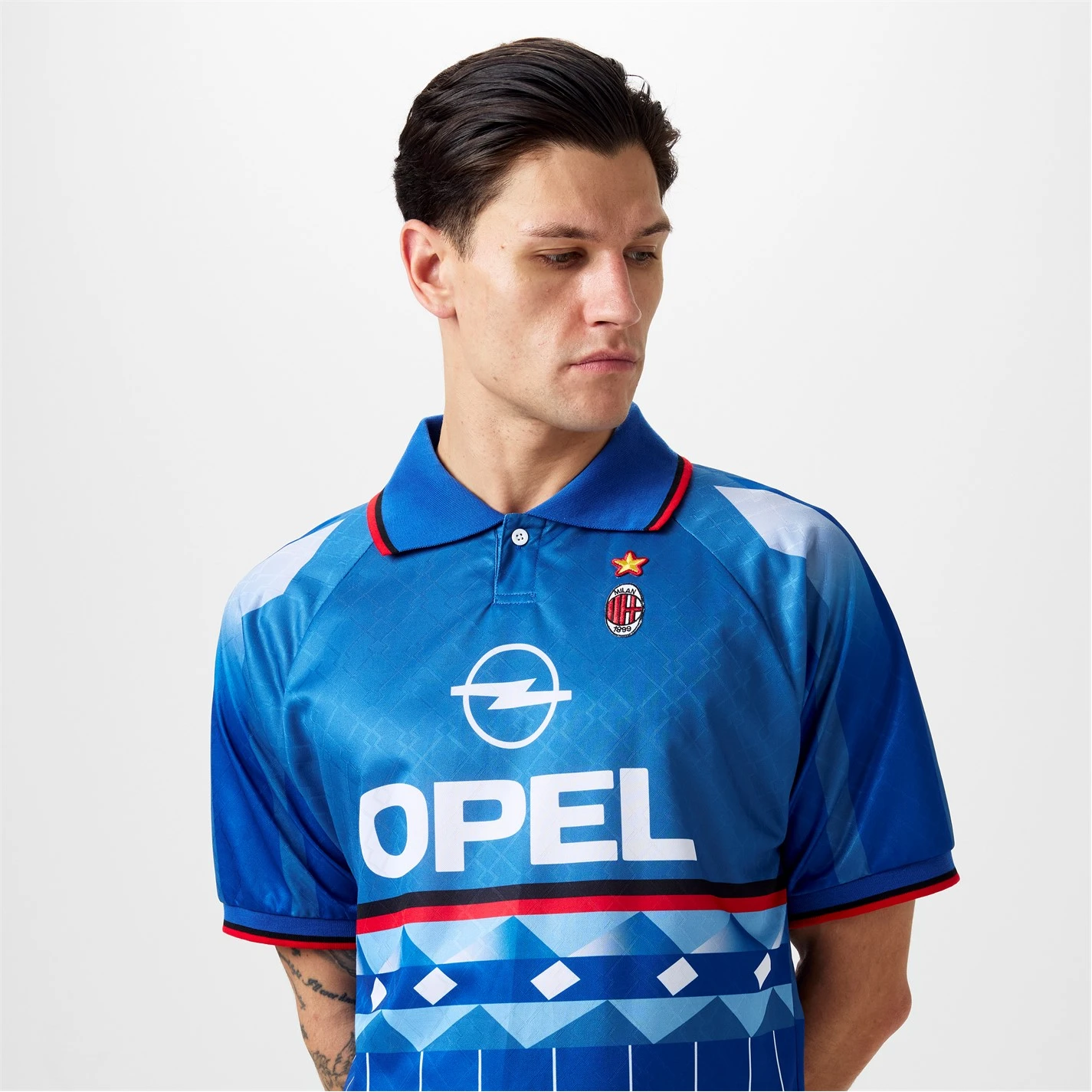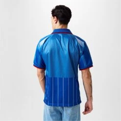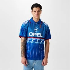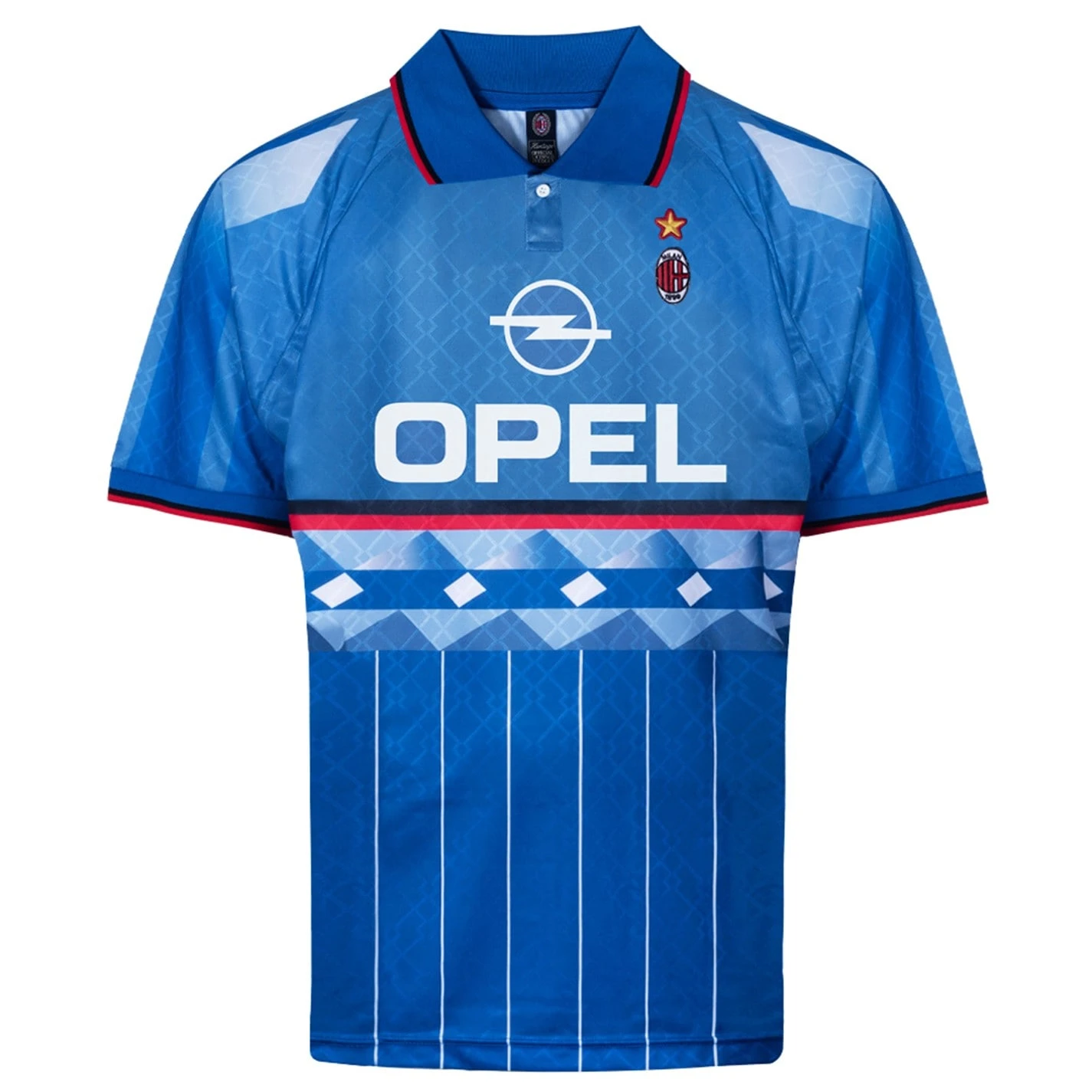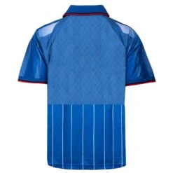 Experience the thrill of AC Milan’s iconic 1995/96 season with the Score Draw AC Milan Fourth Shirt for adults. This blue jersey, also known as the legendary hidden jersey, is a symbol of innovation and a connection to millions of fans around the globe. Worn by the Milan team during two friendly matches in the summer of ’95, this shirt instantly became a legend that fans became deeply attached to. With its official AC Milan logo patch and star proudly applied to the left chest, this shirt showcases the club’s rich history and prestigious achievements. The Opel logo, Principal Partner of the ’95/96 season, is printed on the front, while a striking geometric design in blue and azure tones adorns the front, back, and sleeves. The horizontal red and black strip on the front adds a touch of timeless style, while the collar with red and black striped trim exudes a bold, confident look. This shirt features a partial opening with one button and short sleeves with ribbed cuffs, complete with red and black striped trim. 100% Polyester. Machine washable, follow care instructions.